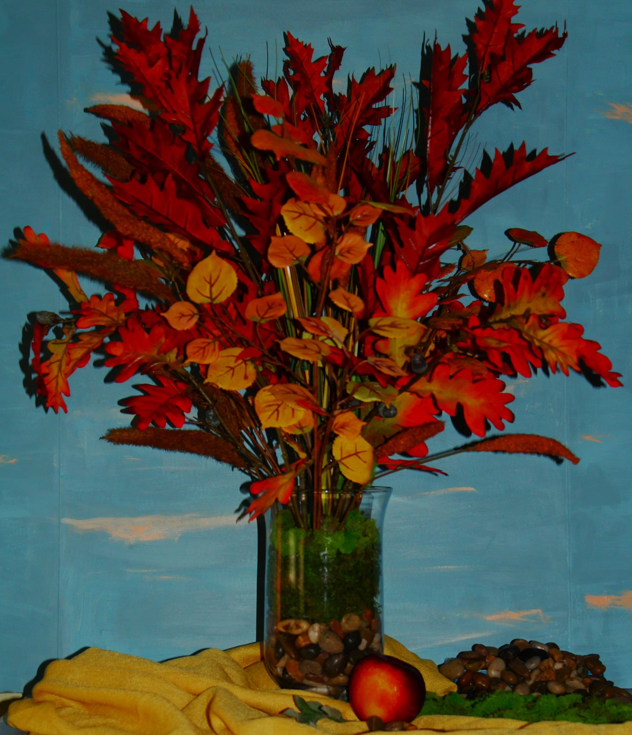 Fall Oak Leaf Spray, Birch Spray, Red Oak Leaf Branch, Brown Setaria/Onion Grass, River Stones, Moss. Glass Vase.
