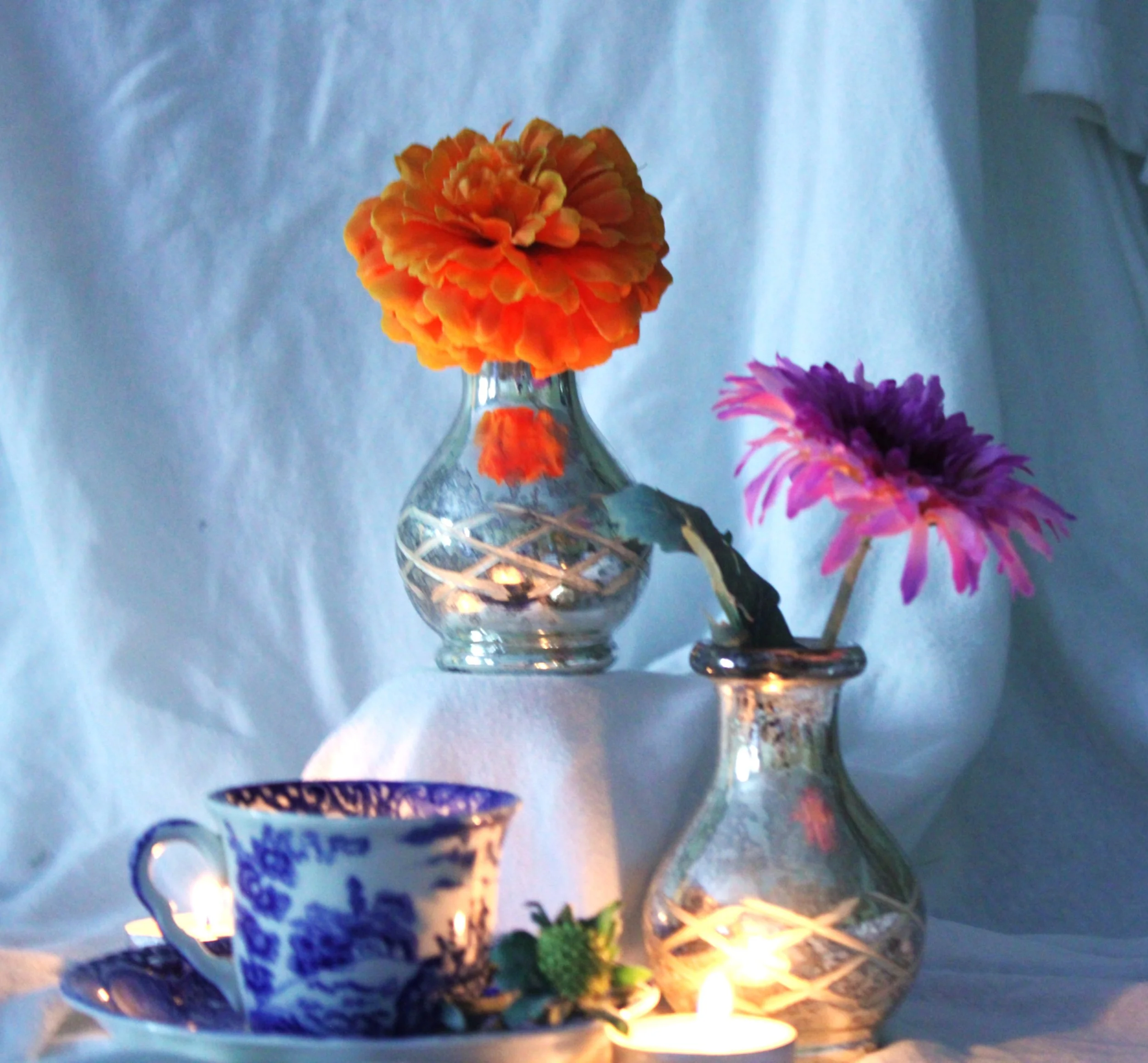 1.Marigold, Antique Silver Bottle Bud Vase 2.PurpleTransvaal Daisy, Antique Silver Bottle Bud Vase