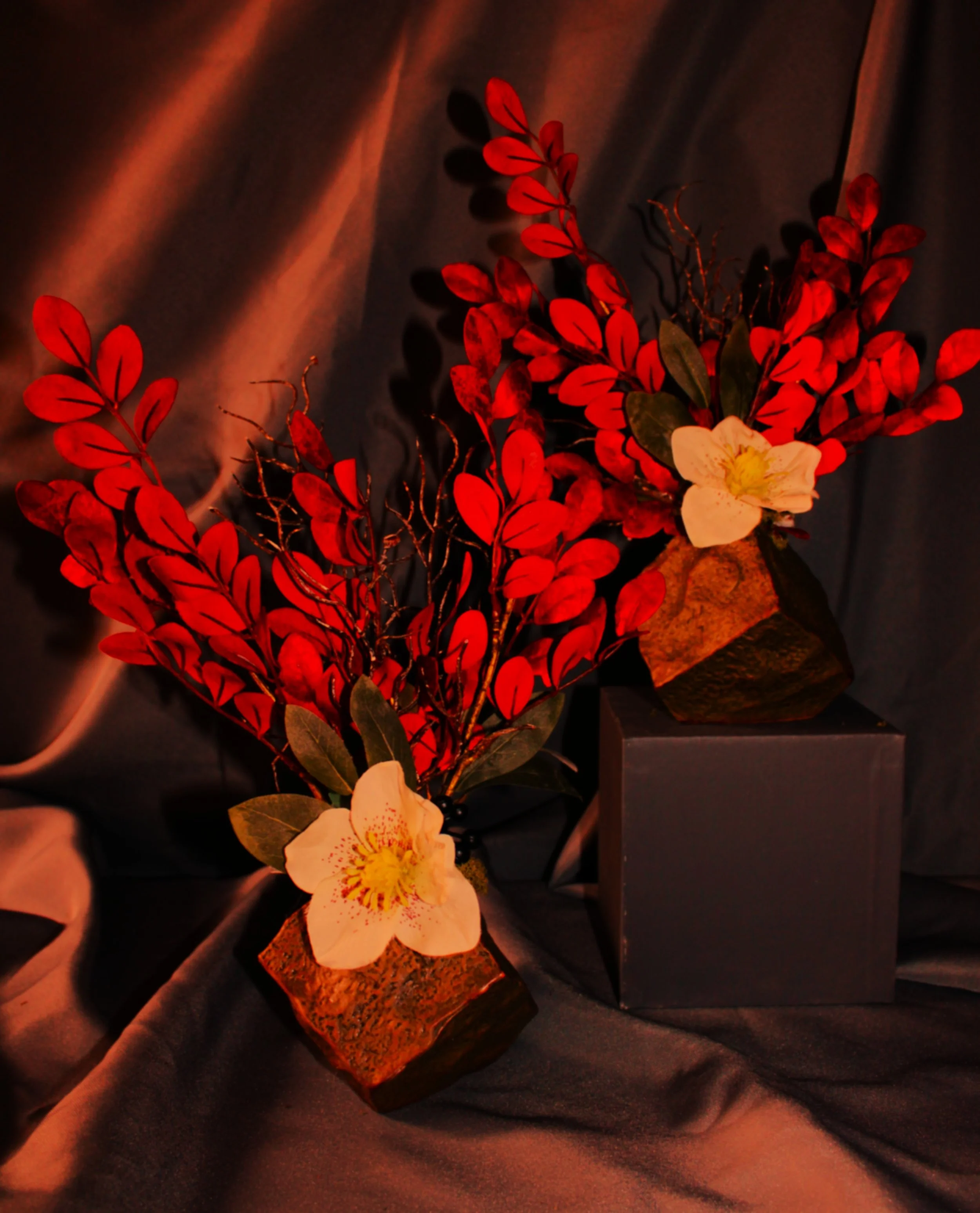 Stone Ceramic Stone Vase, Red Metallic Leaf Pick, Evergreen Leaves, Young Willow Branch, White Orchid