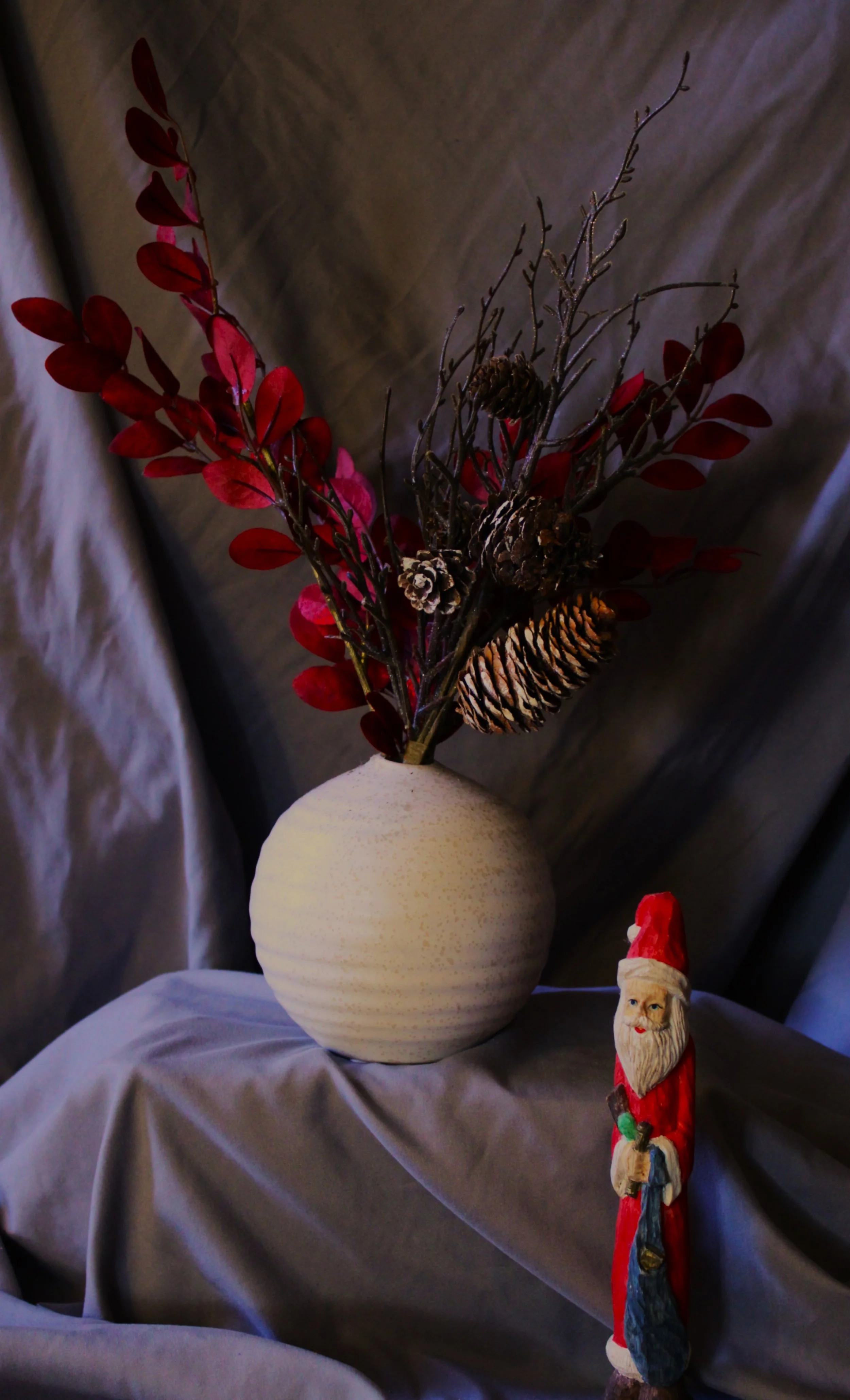 Winter 10 Winter/Holiday Nov 18 Written By Andor Consulting Red Metallic Leaf Spray, Iced Twig w/Pine Cones, Cappadocia Sandstone Ball.Approx. H. 11.5 W. 13"Price: $ 37.00 HolidayChristmasRedSprayPineSandstone Andor Consulting