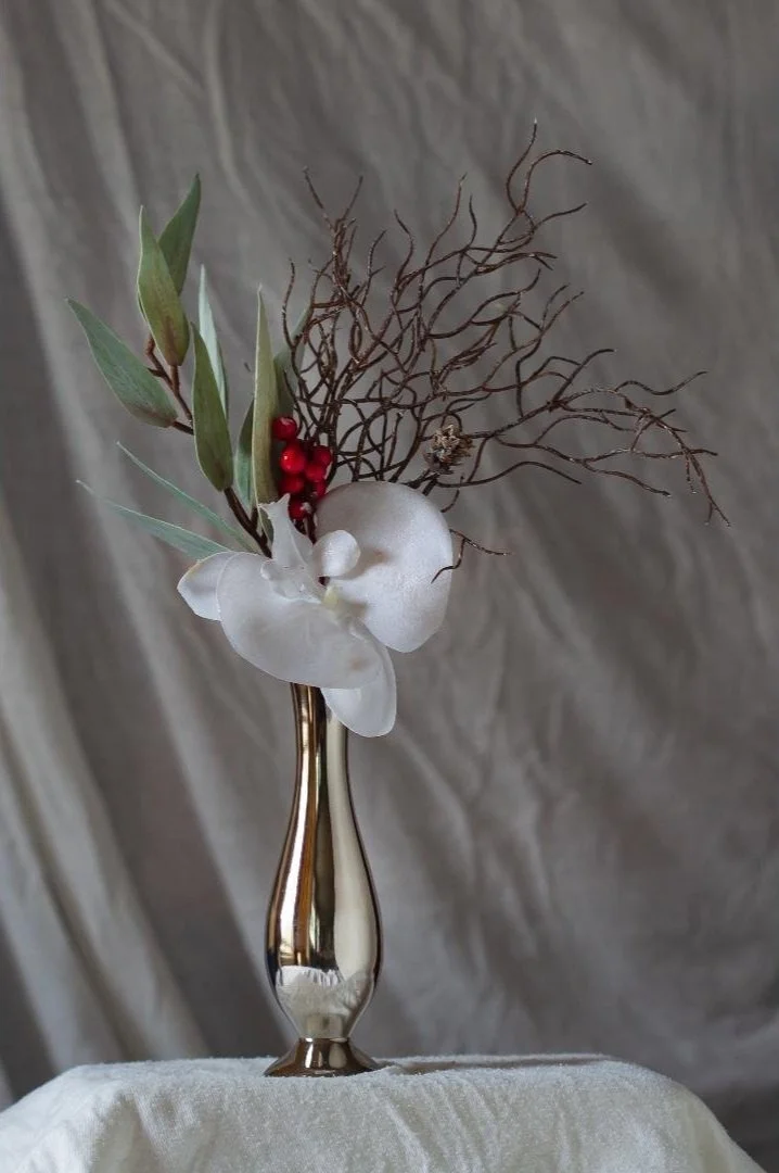White Orchid, Pale Green Eucalyptus Branch, Young Willow Branches, Nichel Vase