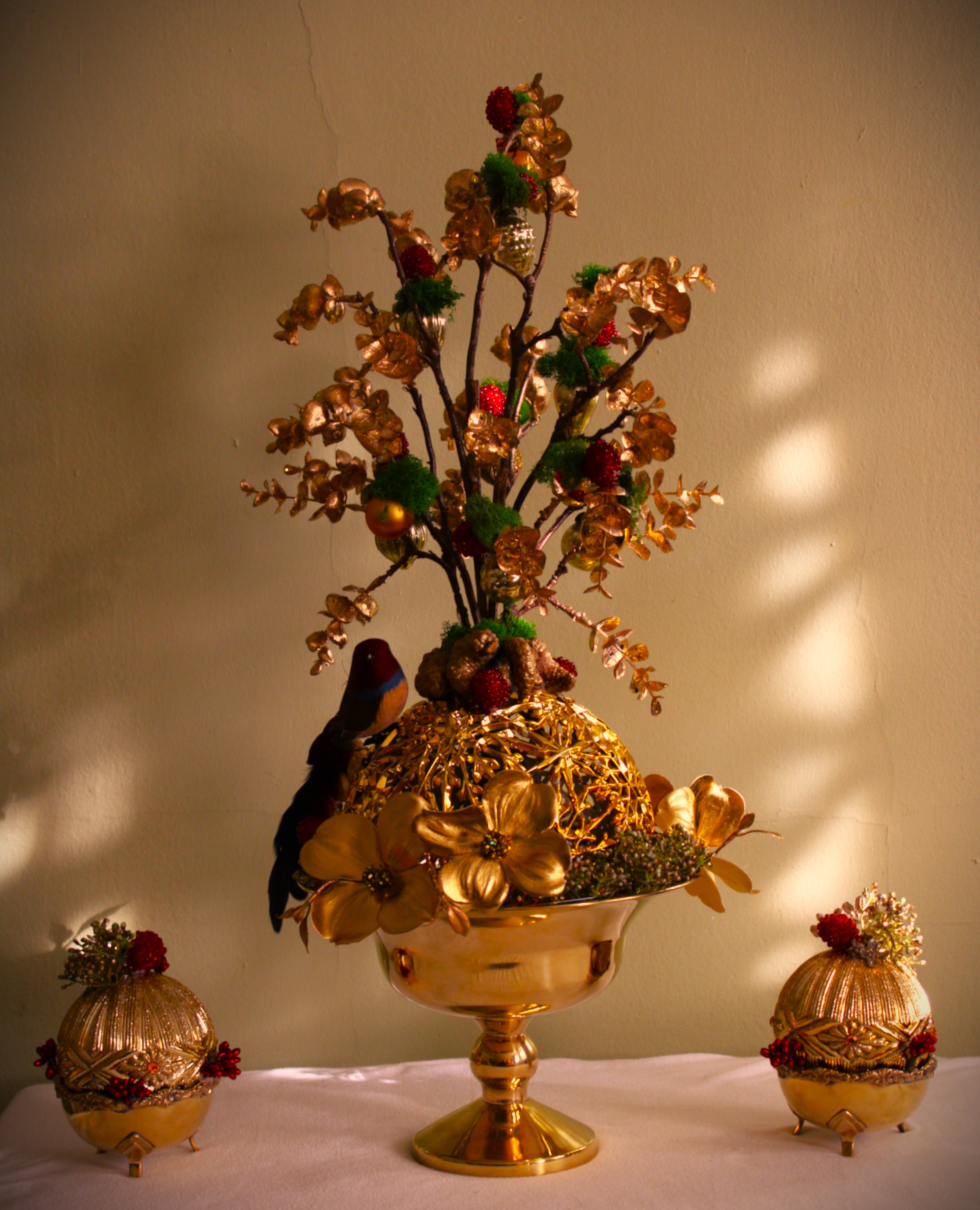 Gold Eucalyptus, Gold Dogwood, Red Berries, Sm. Gold Pinecones, Antique Gold Ornaments, Moss, Gold Snowball Ornament, Brass Urn, Red/Brown Bird